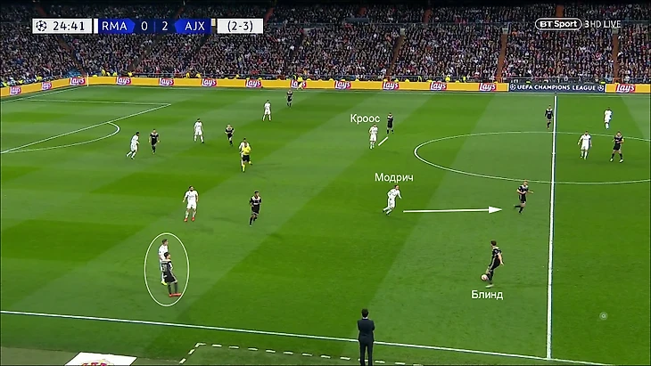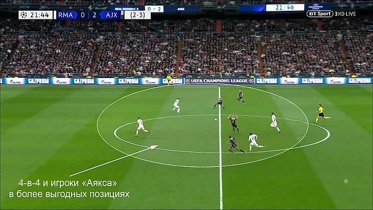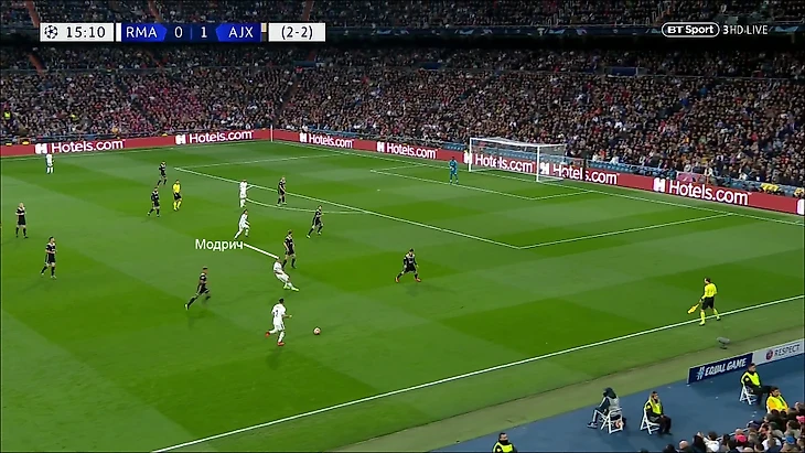 Если момент оставался за «Аяксом», то получалась не менее убойная контратака – например, 4-в-4 с отчаянной попыткой Луки Модрича отработать справа в защите (никаких претензий к хорвату, просто показывает, как разбалансирован был «Мадрид» в такие моменты):