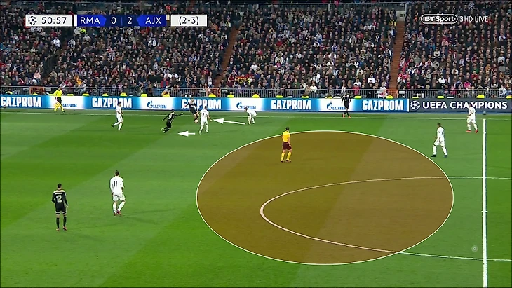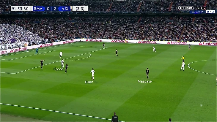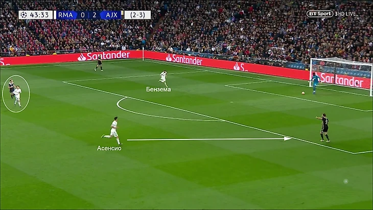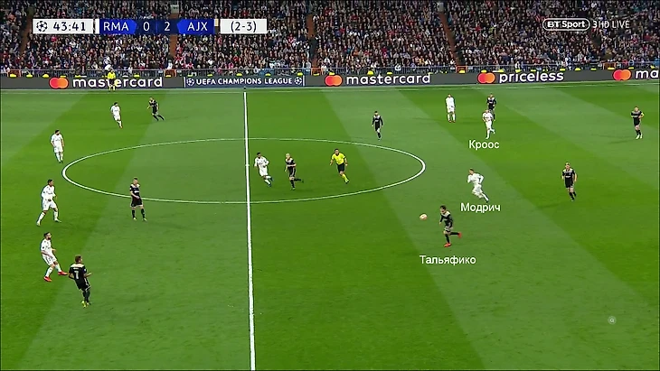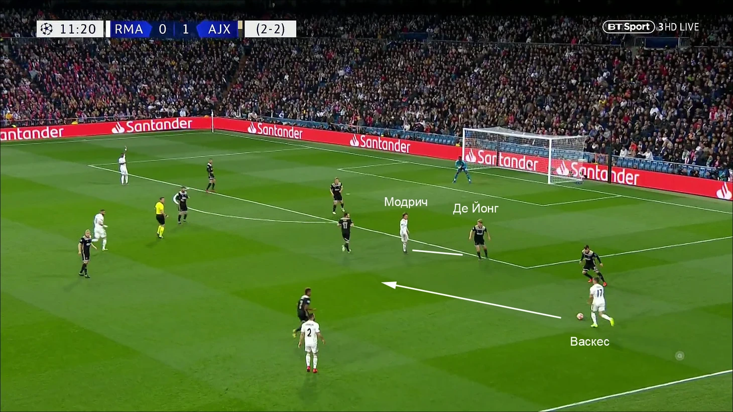 Дальний пас, подбор выигрывает Николас Тальяфико, которого Асенсио оставил для помощи Бензема. Кроос и Модрич слишком высоко из-за поддержки прессинга. У «Аякса» приятное соотношение сил в атаке: