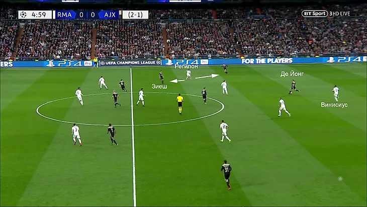 Например, в этом эпизоде у «Мадрида» в прессинге застрял Винисиус, следовательно, Регилон выдвигается на правого защитника Нуссаира Мазрауи. Правый полузащитник Зиеш сразу же пользуется своей свободой и создает де Йонгу вариант для продвижения в центральной зоне: