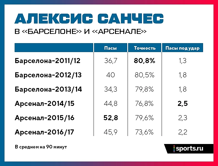 В каждый сезон «Барса» ощутимо больше владела мячом: по логике Санчес должен был чаще получать мяч именно в испанской команде, но наблюдается обратная ситуация. Это возможно только при большой свободе Алексиса в «Арсенале» – теперь он получил право стягиваться в зону мяча и намного чаще рисковать (падение точности передачи и увеличение количества передач под удар).
