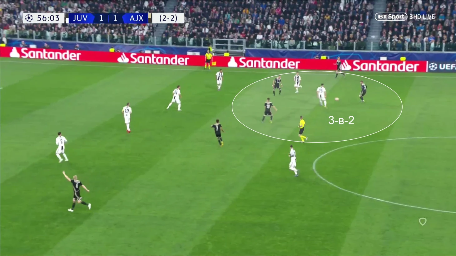 Обратная сторона такого рисунка – количество игроков в атаке. Два крайних защитника плюс полузащитники, помогающие насытить штрафную. Все игроки просто шли вперед и рисковали (не были готовы к контрпрессингу в случае потери). Это открывало «Аяксу» шикарные возможности для контратак. Настолько, что гости, кажется, были ближе к 3-му мячу, чем «Юве» к равному счету.