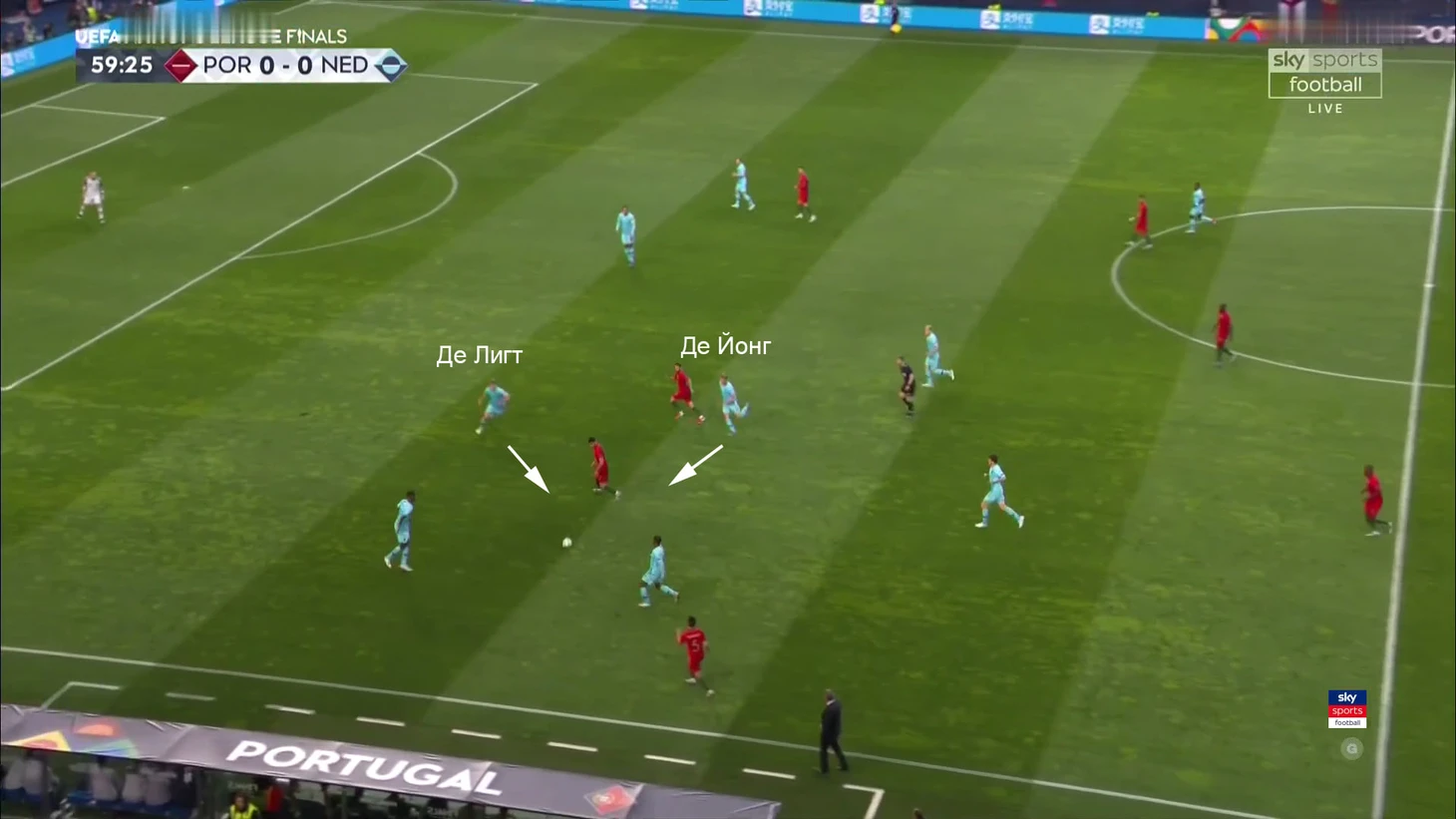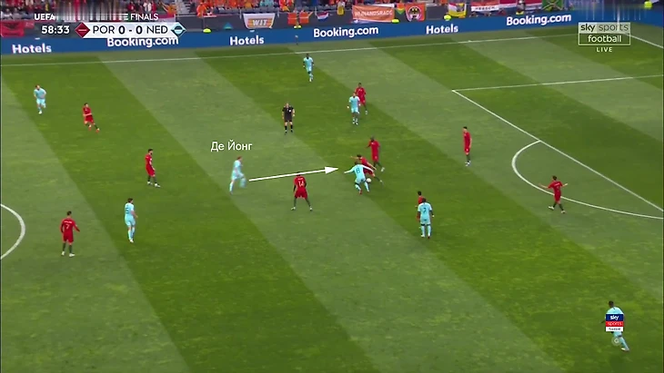 8. Гол Португалии не только хорошее движение атакующих игроков со сменой позиций, но и категорически странные действия де Лигта и де Йонга. Оба в оборонительной ситуации просто смотрят на мяч, не оценивая ситуацию вокруг себя. Бросаются к мячу – и допускают провалы в более важных зонах: