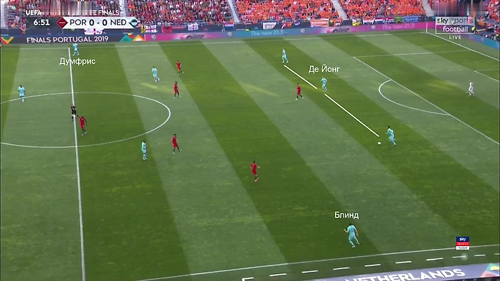 Де Йонг на одной линии с Ван Дейком и Де Лигтом. Думфрис идет вперед – уже располагается выше полузащитников и продолжает движение. Блинд – в осторожной позиции: