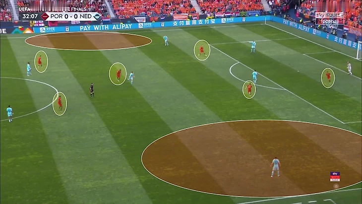 Португалия перекрывала центр, иногда почти полностью игнорируя фланги. Все команды пытаются при обороне в первую очередь закрыть центр, но мало кто доходит до такой радикальности.