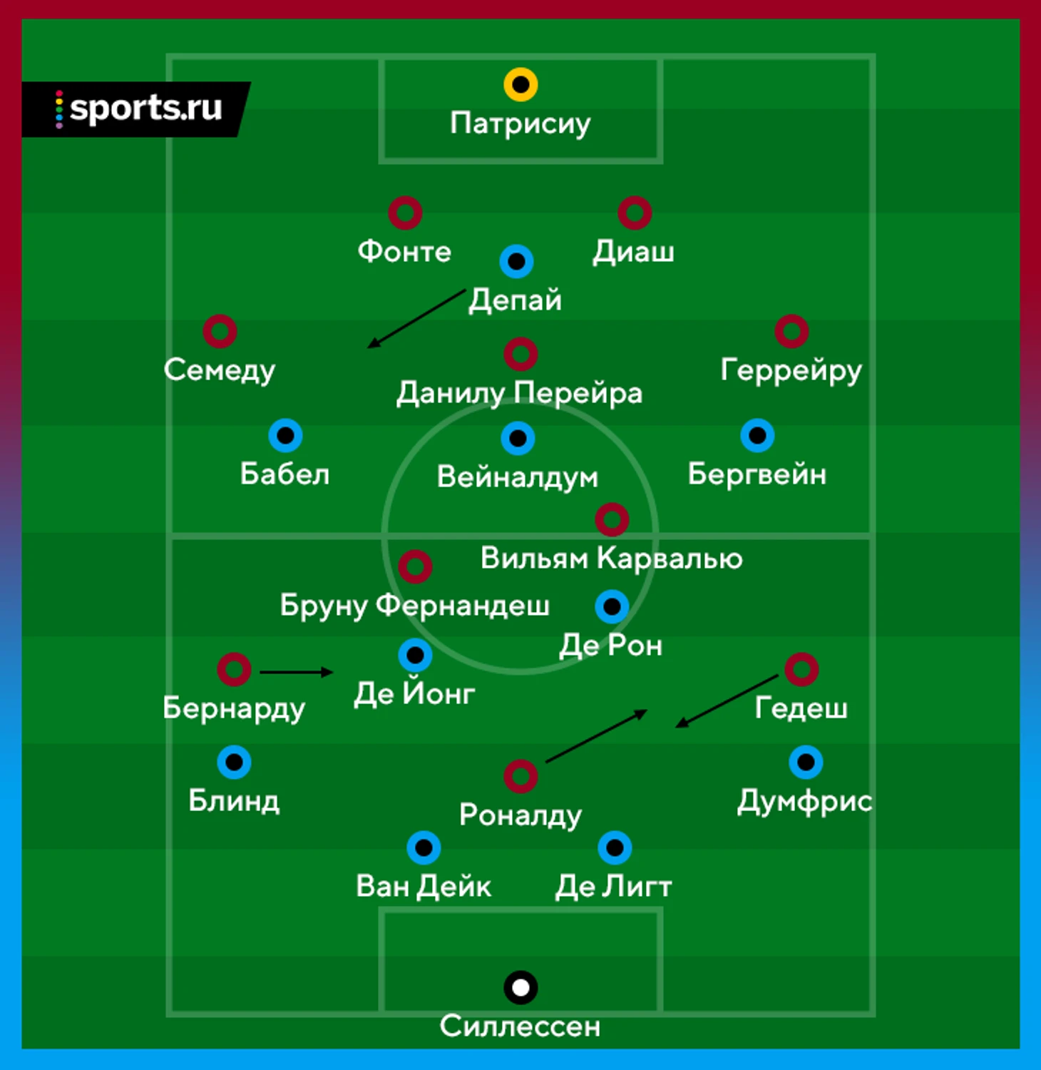 Теперь схема выглядела как 4-4-2 (или даже 4-2-4). В опорной играли Френки де Йонг и ван де Бек, Депай и Люк де Йонг составили пару форвардов. Игра предельно упростилась. Главный прием – заброс на большого нападающего Люка де Йонга, который скидывает на врывающегося ван де Бека или Депая. Это тоже несильно помогло.
