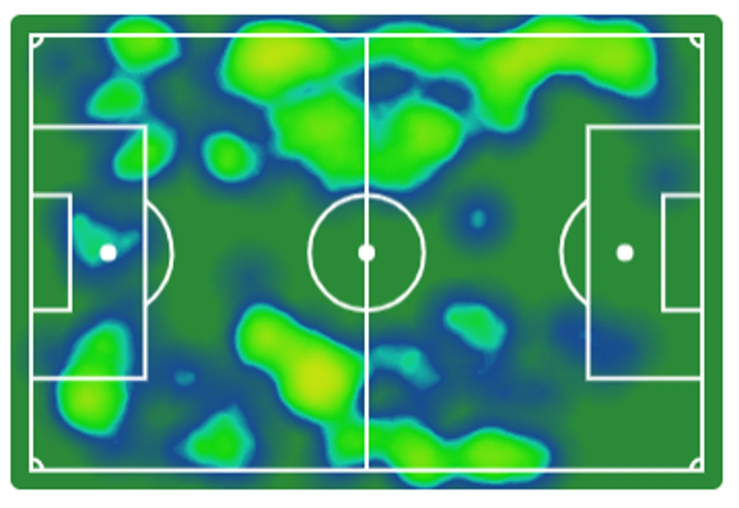 Из «Сити» тренер взял узкие позиции фланговых защитников для сдерживания контратак. Вот совместная тепловая карта Сандро и Алвеса – они много времени проводят на позиция центральных полузащитников: