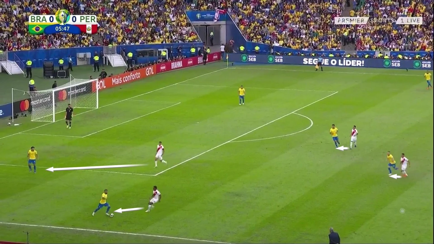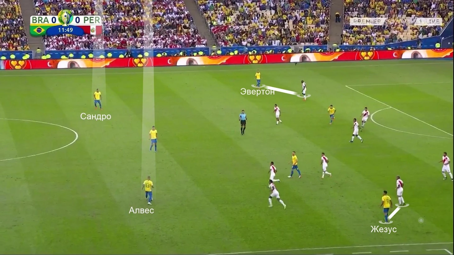 Постепенно Бразилия начала использовать этот аспект против Перу. Алвес и Сандро даже в позиционных атаках не спешили закрывать фланг. Они сужались (иногда одновременно). Это приводило либо к ситуации 1-в-1 для Габи Жезуса и Эвертона на флангах, либо к ослаблению давления Перу (если Флорес и Каррильо опасались бросать защитников 1-в-1):