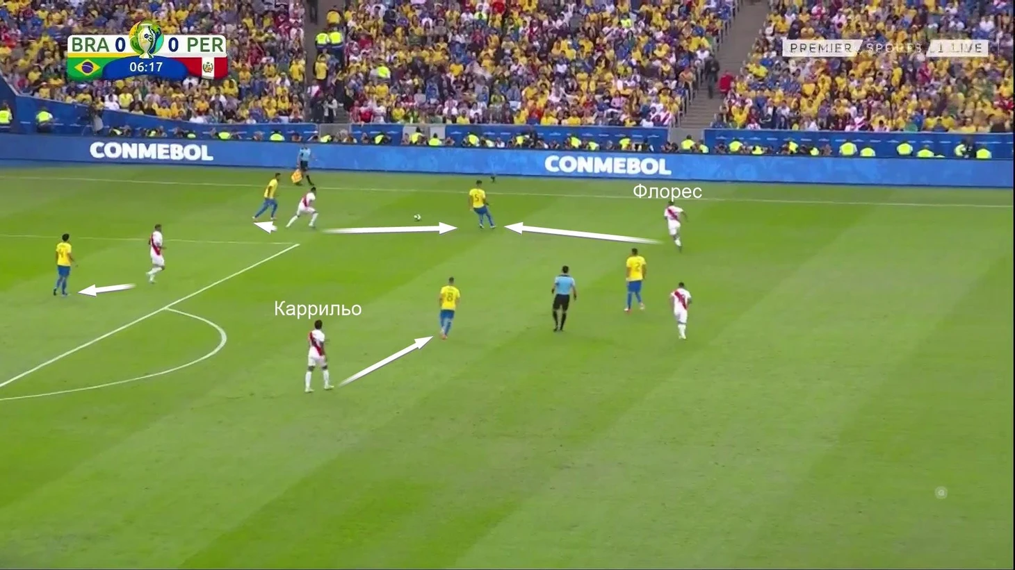 Фланговые игроки Перу Флорес и Каррильо играют важную роль в прессинге, даже если это вынуждает их проводить много времени в центре:
