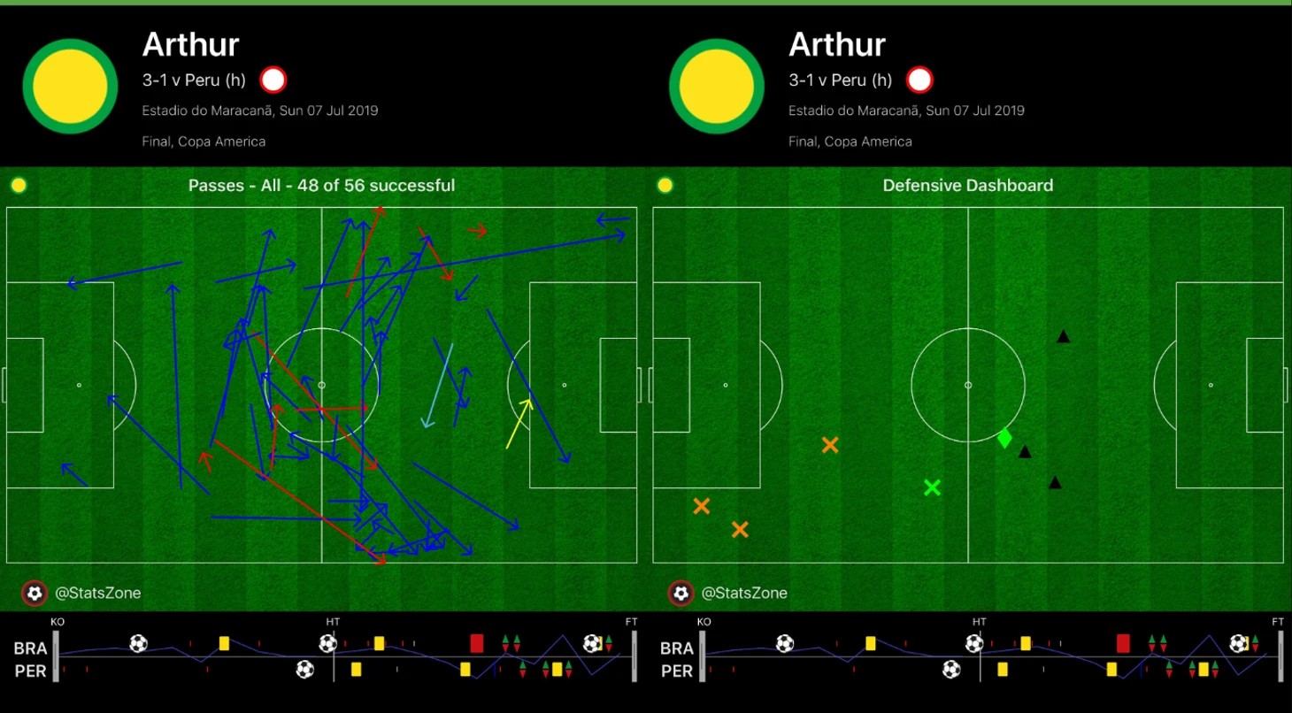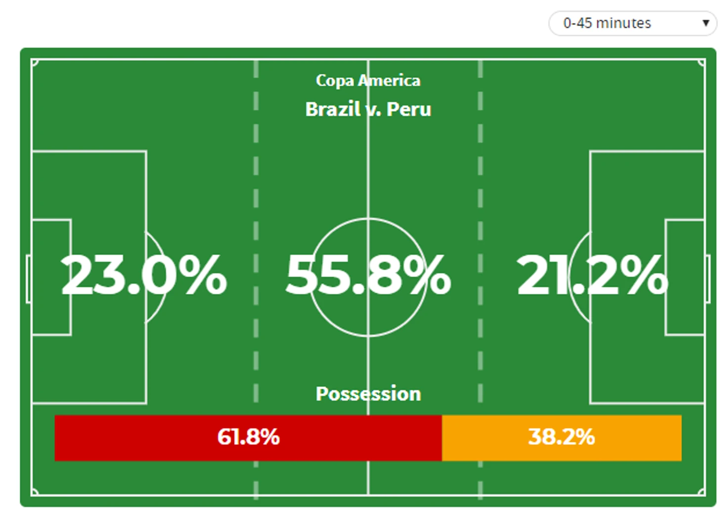 Эффективность давления здорово олицетворяет эта карта. В первом тайме Бразилия намного больше владела мячом (62%), но очень редко у чужих ворот. На трети поля Перу совершалось меньше всего действий. Обычно команда Тите без труда добивается территориального перевеса. Его отсутствие в финале – следствие отличного давления перуанцев.