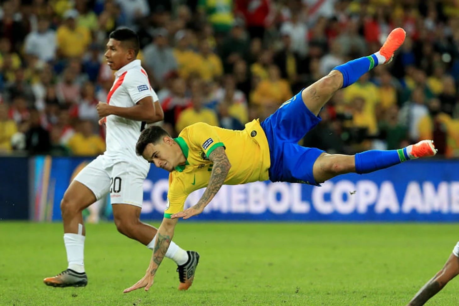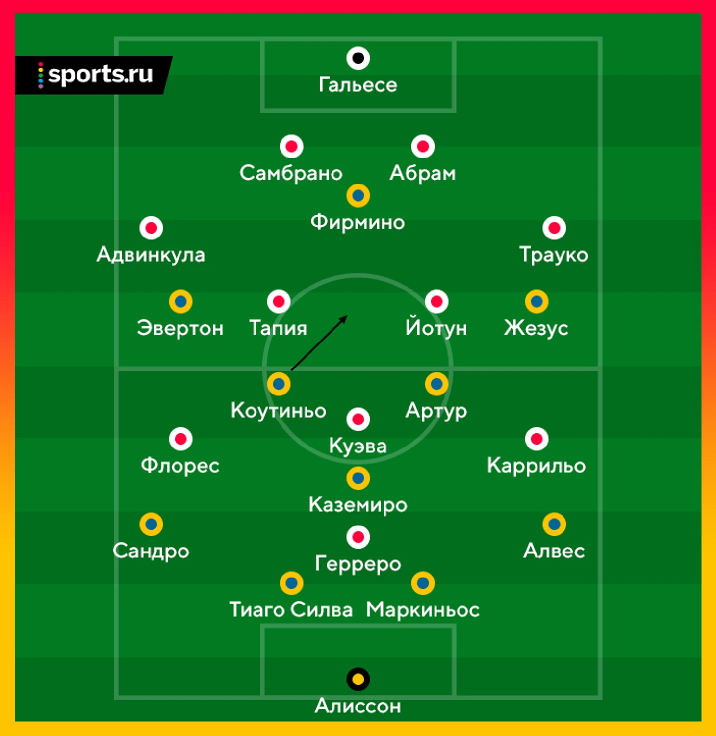 Перу этот недостаток почти не использовал. Артуру и Коутиньо было удобно играть против схемы Перу. 4-3-3 Бразилии против 4-2-3-1 у Перу. В центре поля у каждого был прямой оппонент. Артуру и Коутиньо нужно было просто отрабатывать – принимать трудные решения без мяча не приходилось. С работоспособностью при Тите проблем нет – он заставил работать даже Коутиньо.