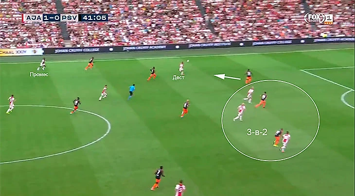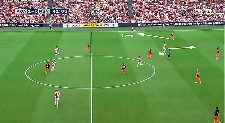 Промес создает ширину в атаке, выманивания Дензела Думфриса, а левый защитник Серджино Дест занимает позицию в центре полузащиты: