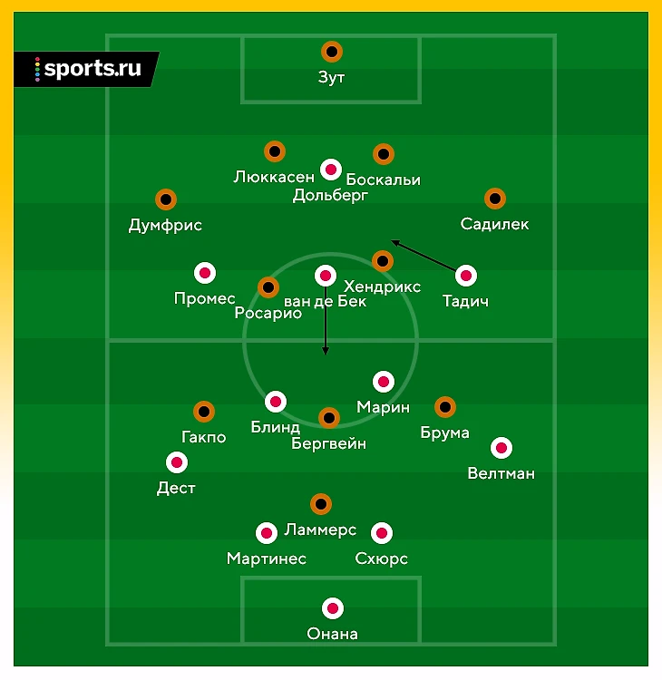 Поскольку продвижение через дриблинг было утрачено, для помощи полузащите чаще оттягивался ван де Бек. Теперь он тоже участвует в доставке мяча вперед, хотя раньше помогал в первую очередь атакующей тройке. Когда Донни опускался, его место в опорной соперника занимал смещающийся с правого фланга Душан Тадич – баланс сохранялся все работало.