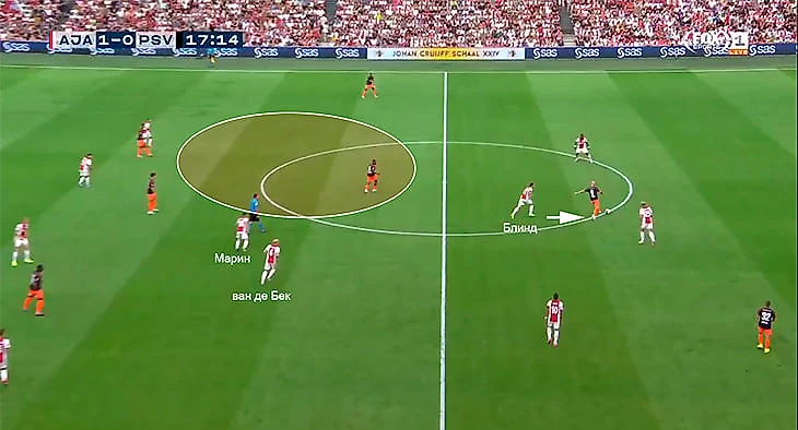 Прессинг тен Хага был уникальным – мы многократно разбирали его по ходу прошлого сезона. Коротко: «Аякс» оставлял одного из фланговых защитников свободным, сокращал зону прессинга, но с невиданной интенсивностью и эффективностью прессинговал оставшиеся участки поля.