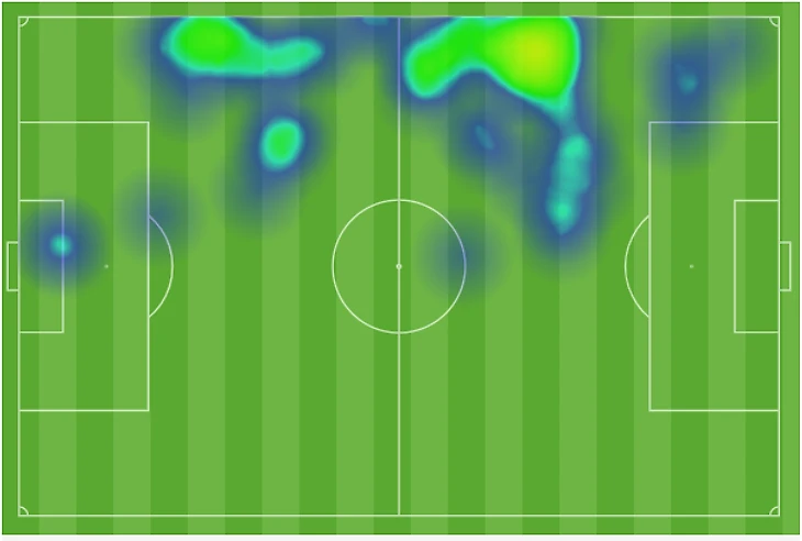 Чтобы сохранять баланс и непредсказуемость, Сарри поручил Сандро использовать аналогичную зону слева. Очень часто он располагался не широко, а в опорной зоне. Это хорошо видно на его тепловой карте за второй тайм. Все еще позиция левого защитника, но с ощутимым островком в опорной соперника: