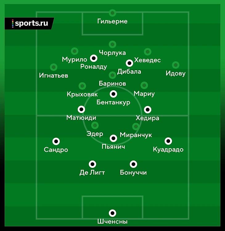 1. Маурицио Сарри выпустил максимально предсказуемый состав в защите и полузащите. В атакующей тройке было несколько интриг. На места рядом с Криштиану Роналду претендовали Пауло Дибала, Гонсало Игуаин, Федерико Бернардески и Родриго Бентанкур. Последний редко играет так высоко и казался аутсайдером в этой борьбе. Но именно его выбрал Сарри на позицию десятки. Еще одно место занял Дибала.