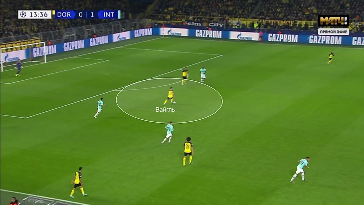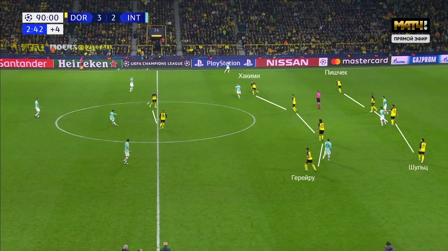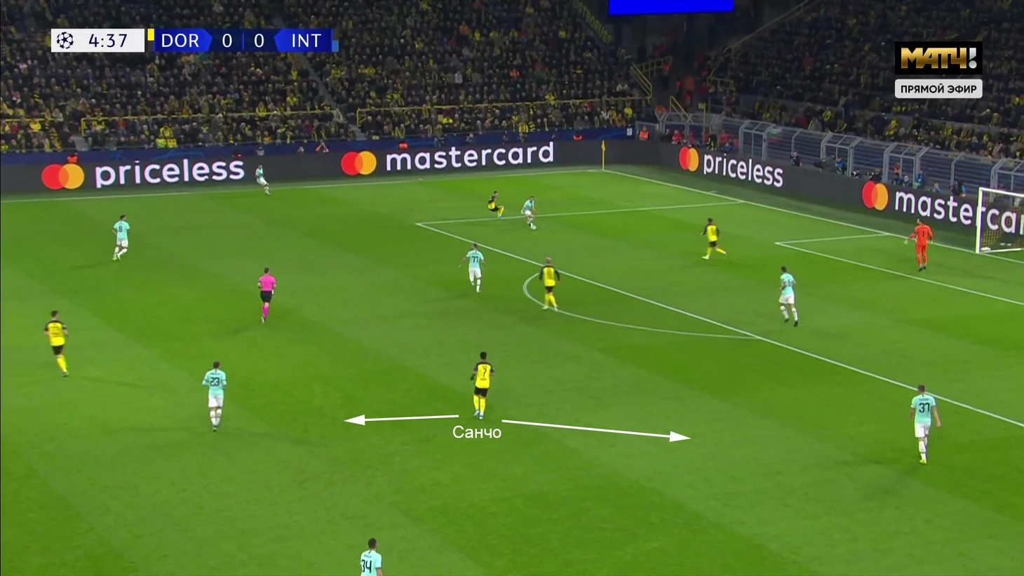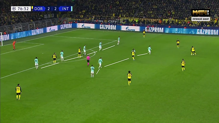 Обычно такой прессинг работает, но система Конте умно растягивала это давление. Правильные расстояния между игроками делали предугадывание трудным. У «Интера» почти всегда находился свободный (на несколько секунд) игрок – «Боруссия» накрывала с опозданием.
