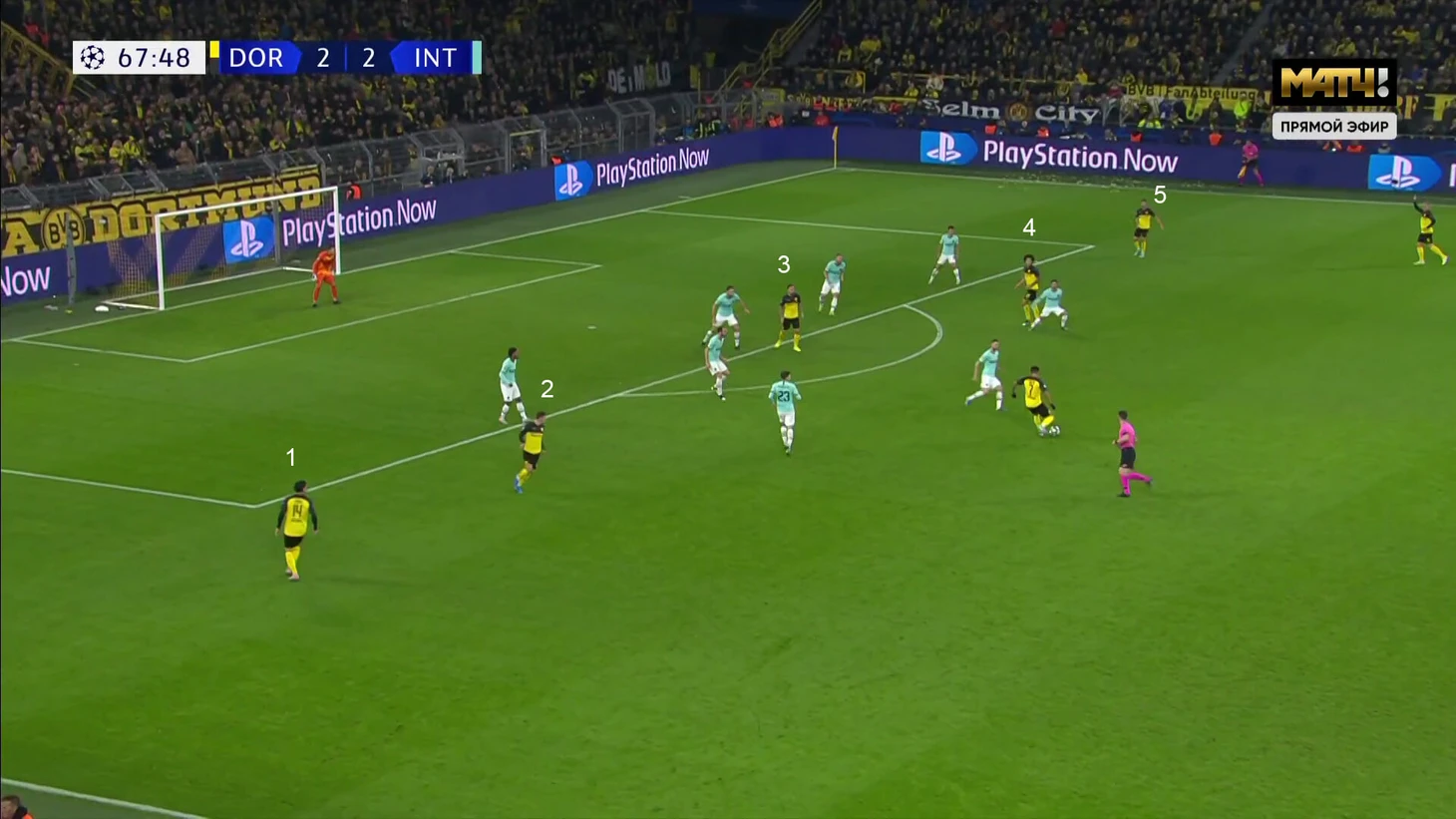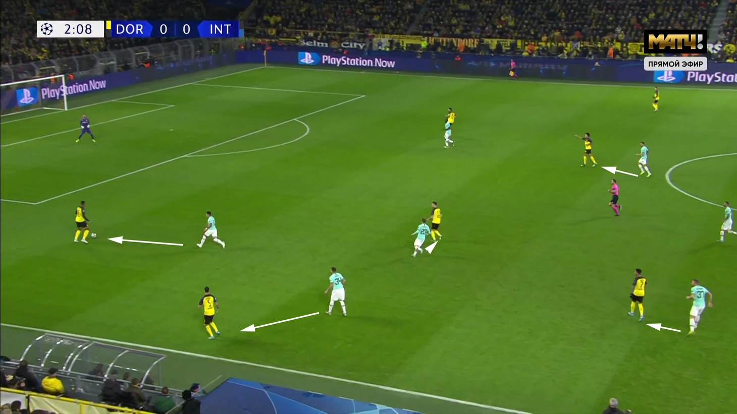 «Интер» привык иметь преимущество, а не равенство в таких эпизодах. Равенство выгодно атакующей стороне. «Боруссия» рисковала, но постоянно создавала такую ситуацию. Кроме того, у «Дортмунда» были хорошие ротации футболистов в позиционной атаке (футболисты могли оказываться в атакующей пятерке – могли чуть глубже в полузащите, но не отнимали друг у друга пространство).