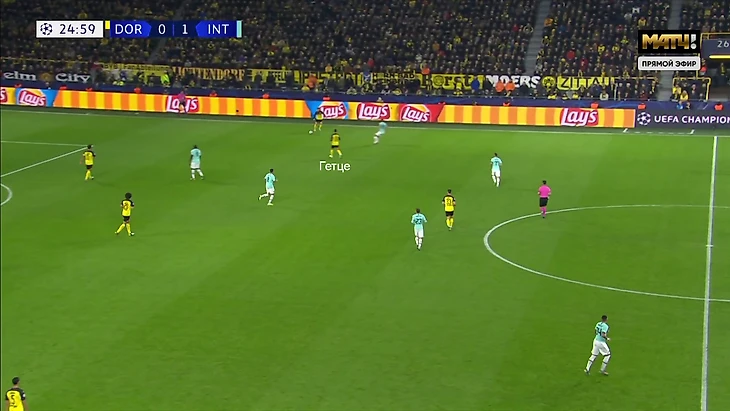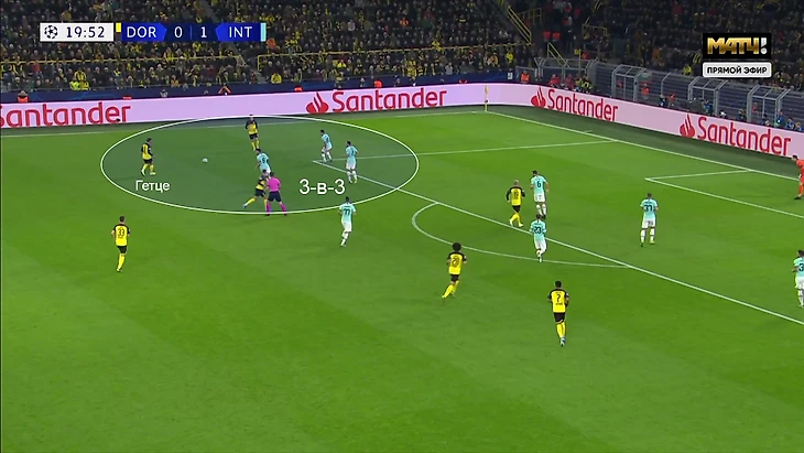 Даже если «Интер» стягивал игроков и создавал равенство, расположение часто было в пользу «Дортмунда» – кто-то из игроков (например, Гетце) получал свободу: