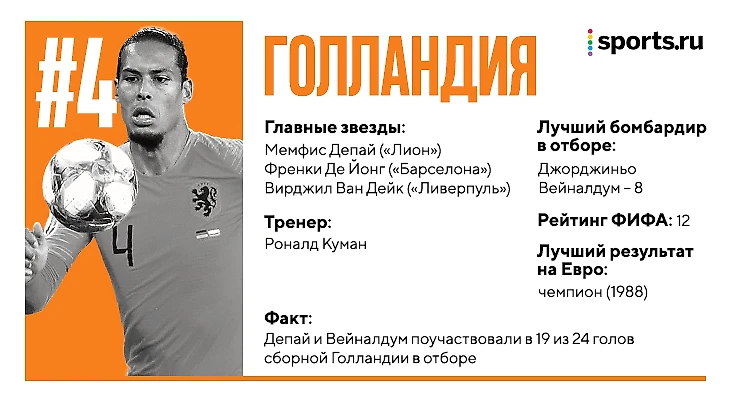 Из-за успехов в Лиге Наций и матчах с Германией в группе Голландия – наиболее испытанная команда последних лет. Почти все испытания они прошли отлично. Настоящая Голландия вернулась – и будет в числе фаворитов.