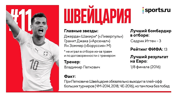 Из предэлитных сборных Швейцария сильнее остальных ставит на владение и терпеливые розыгрыши. Они контролируют матчи за счет владения мячом. Метрономом выступает Гранит Джака (в сборной действительно хорош).