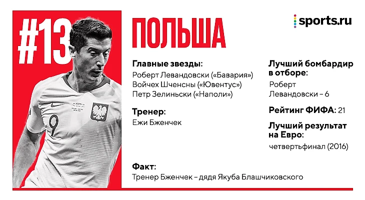 У Польши перебор результативных нападающих (Левандовски, Милик, Пентек), но Ежи Бженчек предпочитает баланс, а не одновременное использование всей атакующей мощи. Для организации команды он использует 4-2-3-1 – команда действительно хороша в защите и пропустила всего 2 мяча в 8 играх отбора, где у них была турнирная мотивация. В атаке создается категорически мало моментов (особенно против равных соперников), но есть Левандовски.