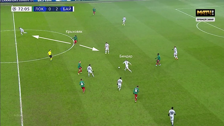 Здесь Свен Бендер получает полную свободу сразу после потери. «Локо» просто не мог накрывать его сразу из-за плохих позиций в момент потери. У Бендера масса вариантов – от прямого обострения за спину защитникам до паса в опорную зону. Крыховяк один должен держать двух соперников (и в данном эпизоде он именно разрывается между ними, а не контролирует обоих как в ситуации при прессинге):