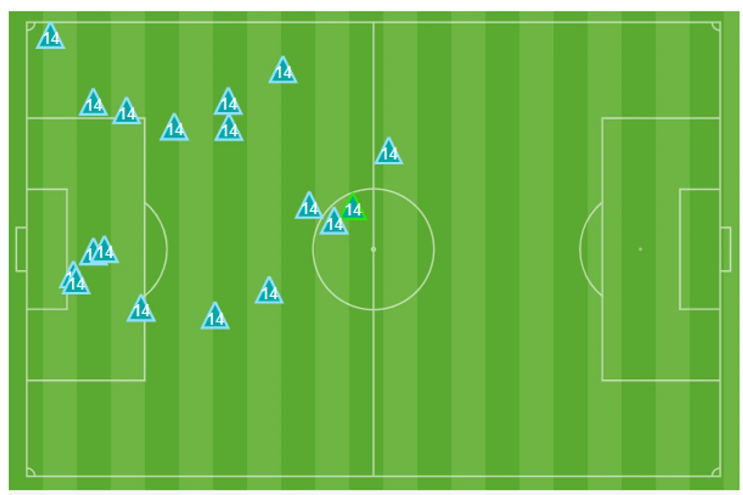 Но даже в таких эпизодах «Локо» не давал «Байеру» легких шансов – огромную зону покрывали Баринов и Крыховяк. Дополнительной страховкой был Ведран Чорлука, который шикарно выдвигался в опорную зону, если она пустовала. Вот карта его оборонительных действий (подборы, отборы, перехваты, выносы):