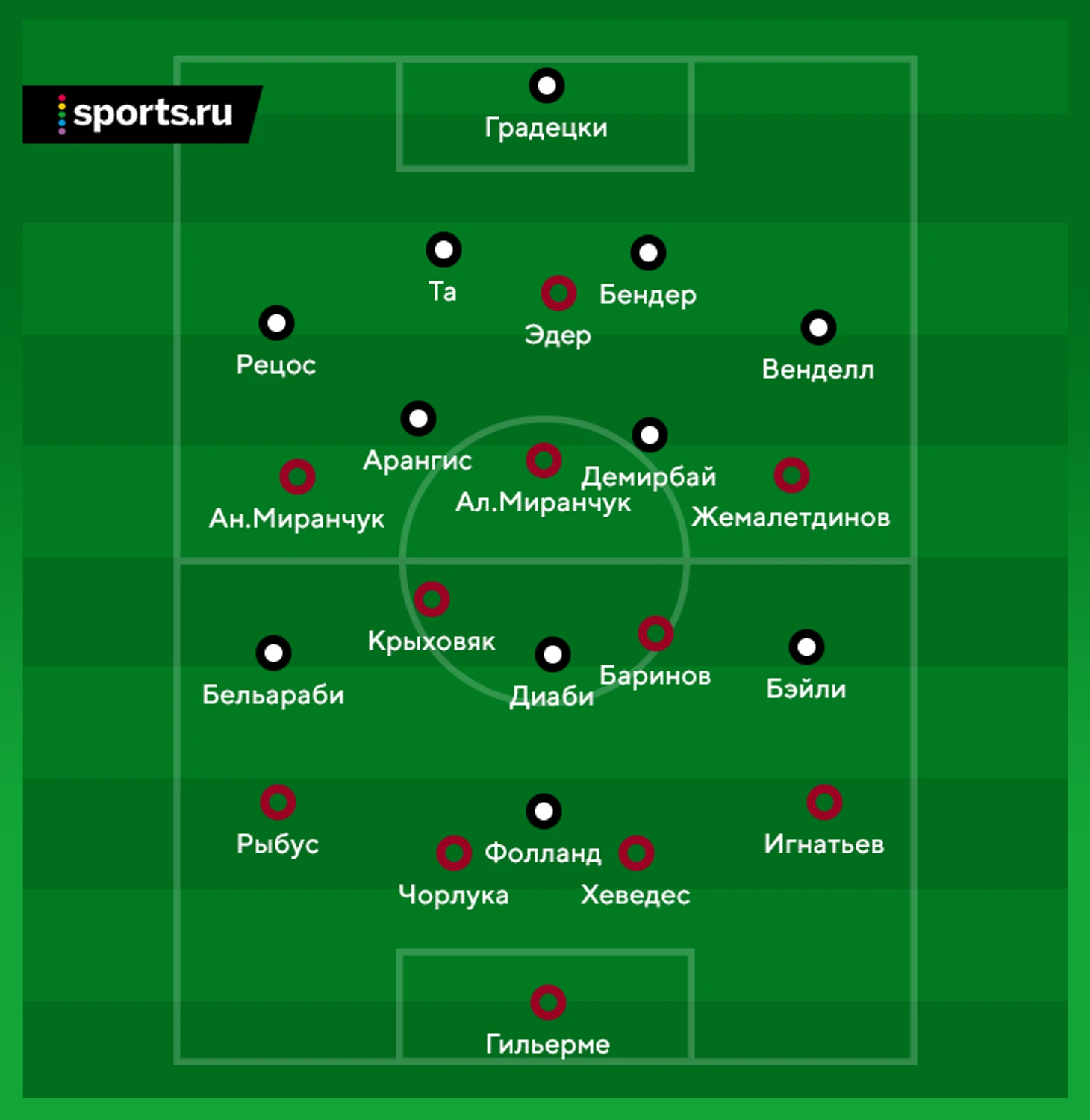 В составе Юрия Семина обошлось без сюрпризов. А вот выбор Петера Боса был нестандартным – впервые в сезоне он сыграл с тройкой Леон Бэйли, Мусса Диаби, Карим Бельараби под нападающим. Интересна даже не сама комбинация (они играют в первый раз – просто потому что Диаби редко выходит в старте), а характер игроков – все трое быстроногие прямолинейные дриблеры. Обычно в тройке есть минимум один игрок контроля/созидания (например, Кай Хавертц).