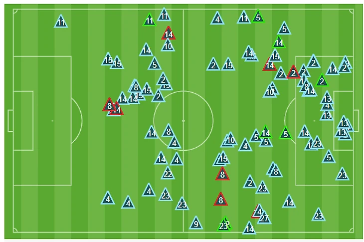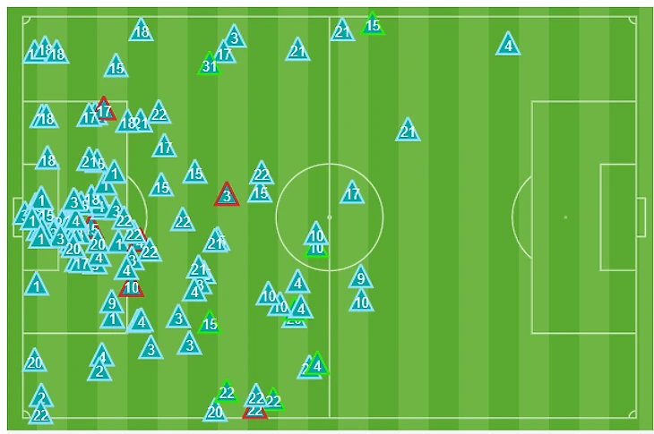 10. Прессинг «Барселоны» был ужасным – особенно на контрасте с «Мадридом». Вот карта оборонительных действий команды Вальверде (чужая половина поля справа):