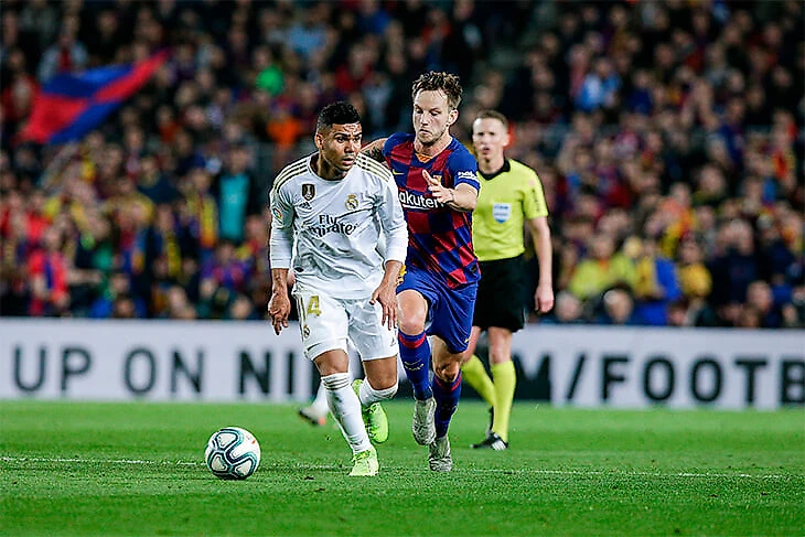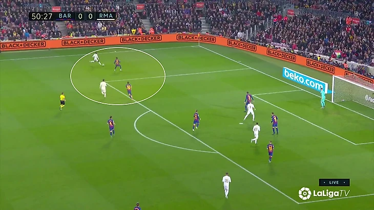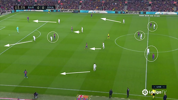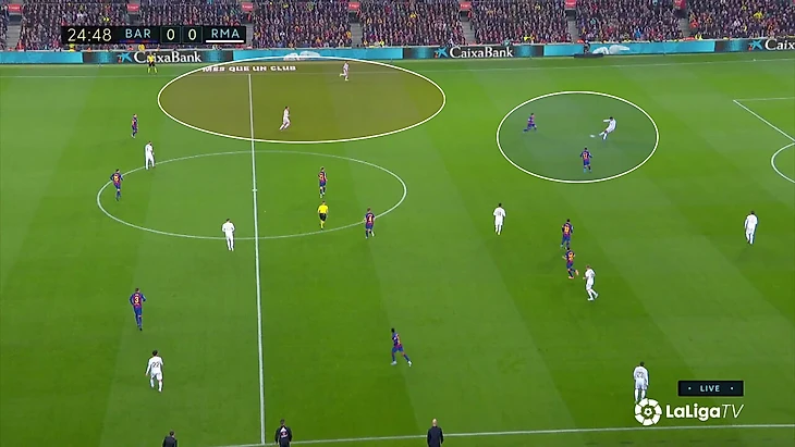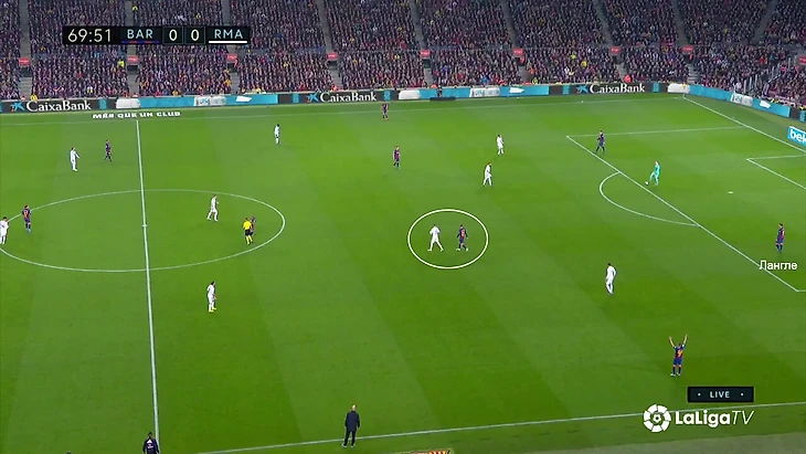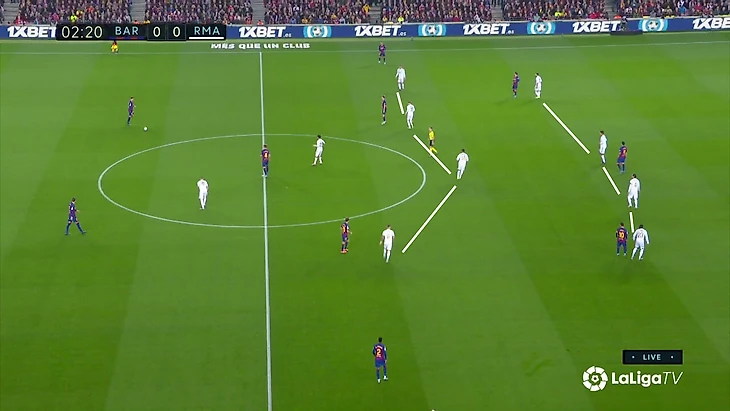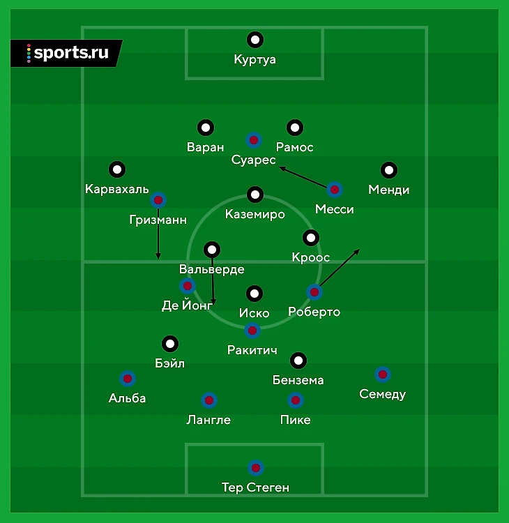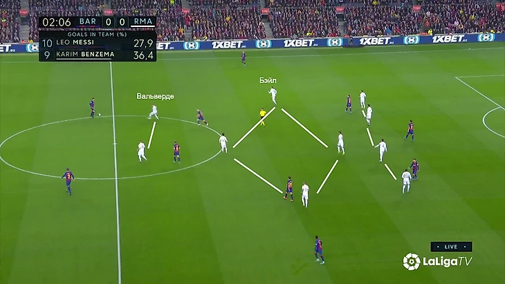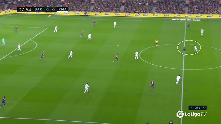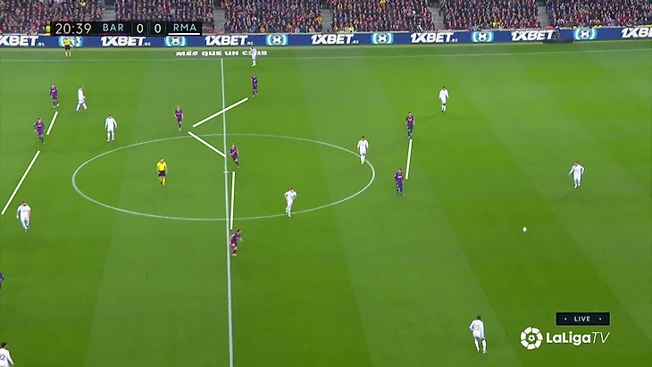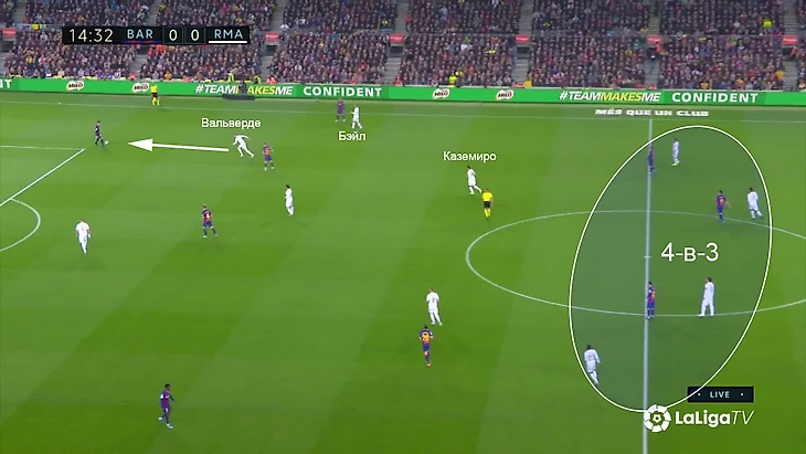 Расклад выливался в такую схему прессинга «Реала»: Вальверде контролирует двух игроков, у «Мадрида» 4-в-3 в последней линии на случай провала прессинга, Каземиро свободен и действует по ситуации, формально у «Барсы» свободен Семеду на дальнем фланге, но позиция Менди позволит его накрыть в случае перевода.
