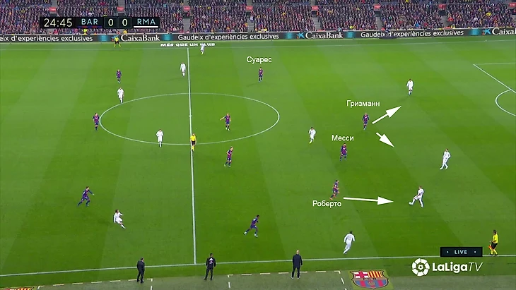 «Барса» показывала хаотичный неподготовленный прессинг. Месси не участвует, Роберто выдвигается с опозданием, из-за этого Гризманн теряется, кого из центральных защитников прессинговать (при правильном давлении был бы ближе к Варану):