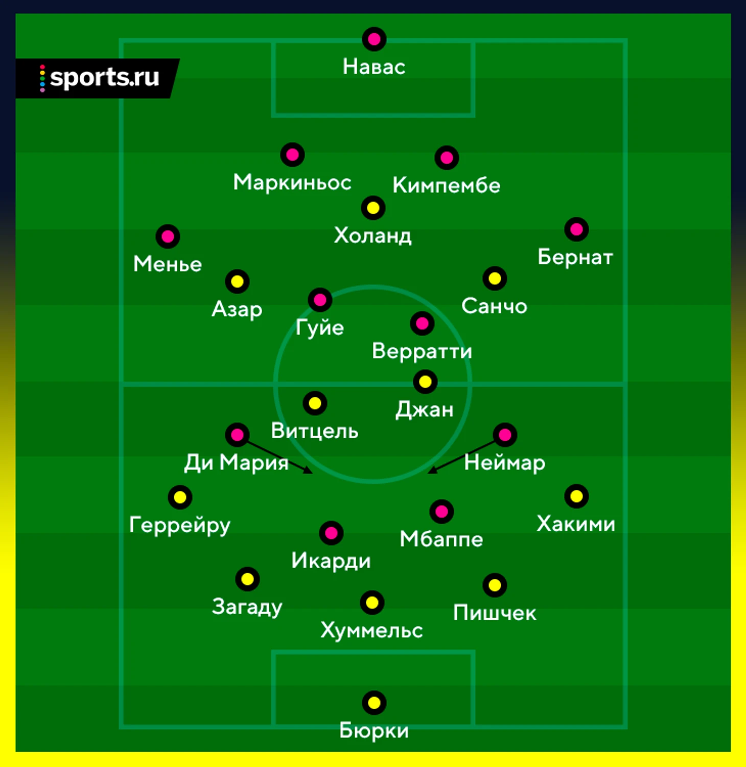Томас Тухель стартовал с формации 4-3-3 без травмированного Неймара. Именно так команда провела лучший матч сезона (3:0 против «Мадрида»). Из-за убойной формы Анхеля Ди Марии и Мауро Икарди после возвращения Неймара пришлось изобретать новый оригинальный вариант.