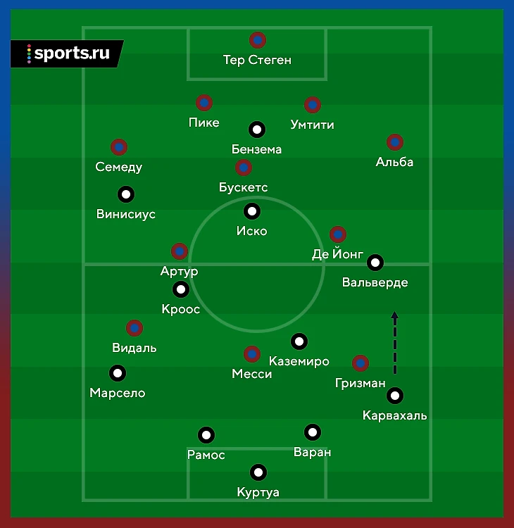 тер Стеген, Альба, Умтити, Пике, Семеду, де Йонг, Бускетс, Артур, Видаль, Гризманн, Месси