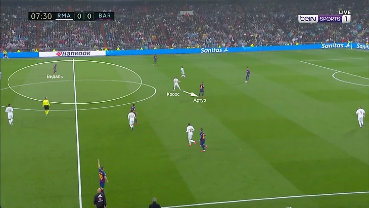 Первый – проходить через Артуро Видаля. Из-за ориентировок на центральных игроков (например, Кроос далеко ушел за Артуром) часто в центре были свободные зоны. Видаль начал матч фланговым игроком. Ему не уделяли такого же внимания – он мог использовать эти зоны, его номинальный оппонент Марсело не следовал за ним в середину поля: