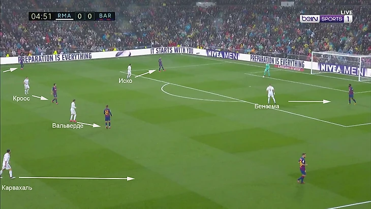 4. Зидан подстроил схему под то, чтобы максимально нейтрализовать центральную ось «Барселоны». В прессинге это выглядело так – Иско и Бензема возглавляют давление, Кроос и Вальверде поддерживают. Правый вингер Вальверде ориентируется не на Альбу, а на игрока центра (Де Йонга), Альбу при необходимости готов накрыть Карвахаль:
