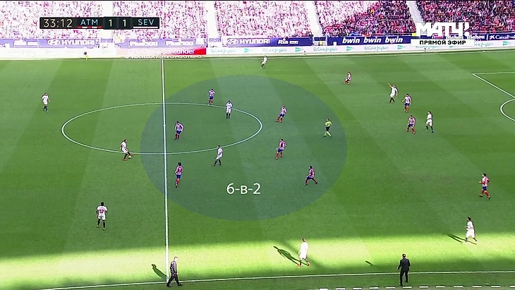 Перейдем к примеру. Из-за узкого расположения вингеров в 4-4-2 «Атлетико» создает гигантский перевес в центре поля – 6-в-2: