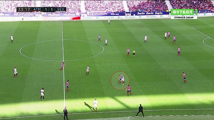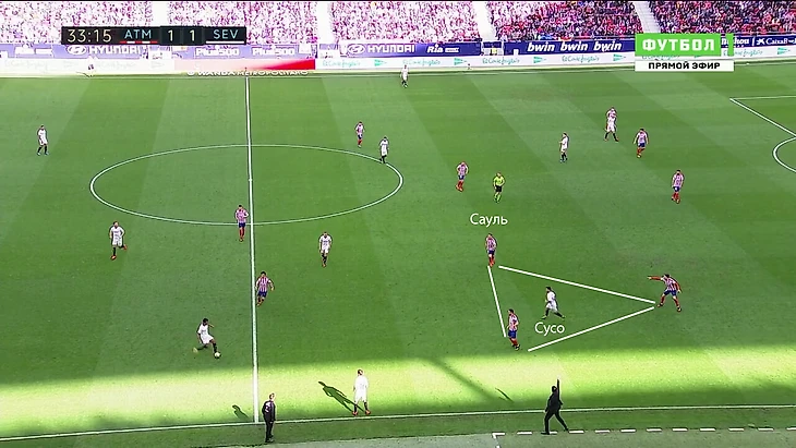 В следующей стадии ловушки ключевым игроком становится помогающий флангу опорник. В данном случае Сауль. За счет его правильной позиции у «Севильи» просто нет продолжения, при котором у них равенство или преимущество: