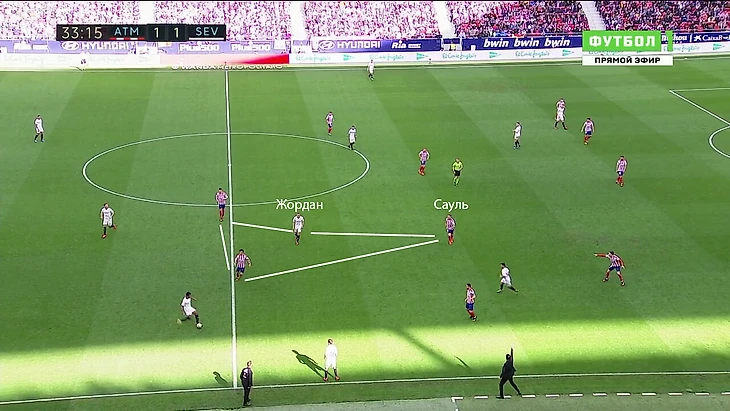 Жордана и Сусо готовы накрывать по три футболиста при попытке паса. Наваса – двое (но его еще ограничивает боковая линия – меньше направлений для движения). Результат – уверенный отбор Сауля: