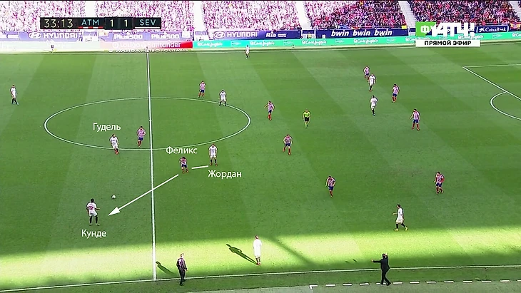 Игрок с мячом (Неманья Гудель) вынужден разворачиваться и пасовать поперек центральному защитнику Жюлю Кунде. Это пас в ловушку. Жоау Феликс перекрывает пас на Жоана Жордана и начинает давление на самого защитника: