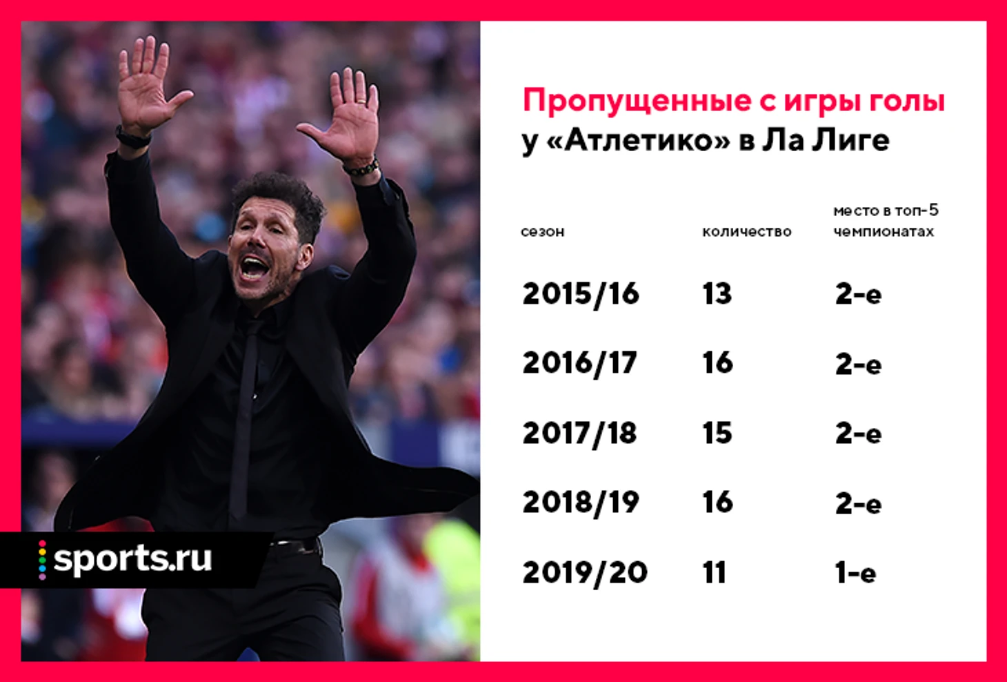 Вот результаты последних сезонов – из 98 команд 5 ведущих лиг Европы «Атлетико» всегда был минимум на 2-м месте по пропущенным с игры. Уникальность в том, что конкуренты постоянно меняются, а команда Чоло поддерживает феноменальную стабильность. Нет других команд, которые не вылетали из тройки хотя бы раз («Атлетико» не вылетал даже из двойки).