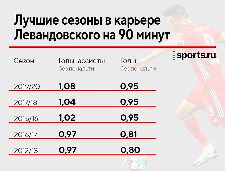 Роберт перенес форму и в 2020-й. Такая результативность – космос даже по его стандартам. По темпу набора результативных действий этот сезон лучший для Левандовского – и по голам, и по гол+пас.