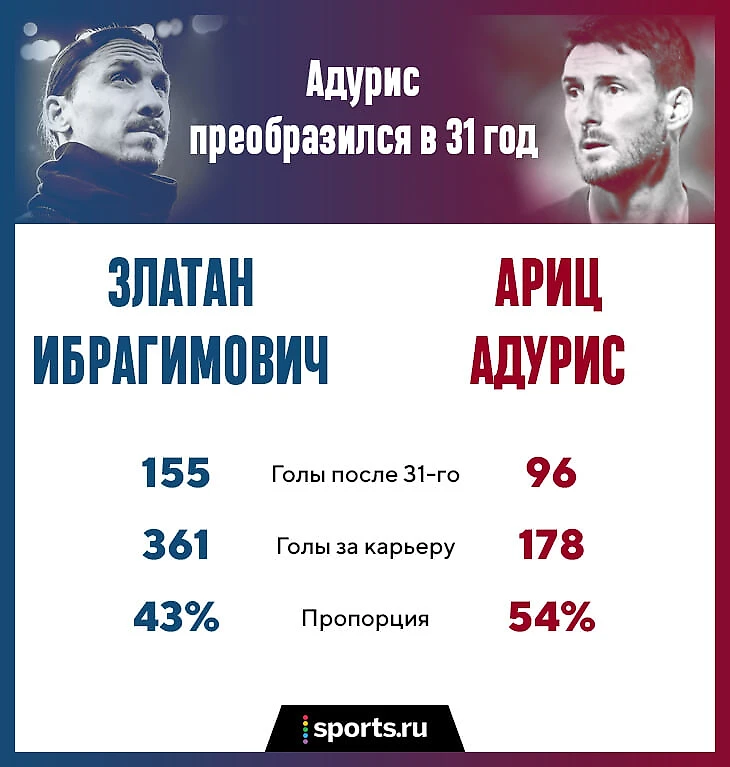 Все сценарии успешной борьбы с возрастом заслуживают уважения и изучения. У Адуриса вообще радикальный случай – именно в 31 год его карьера полностью перевернулась. Он не просто отказывался стареть, он вышел на заметно более крутой уровень. Такие примеры очень редкие. Один из самых известных – Златан Ибрагимович, который тоже стал больше забивать на позднем этапе. Но Ариц прибавил еще сильнее.