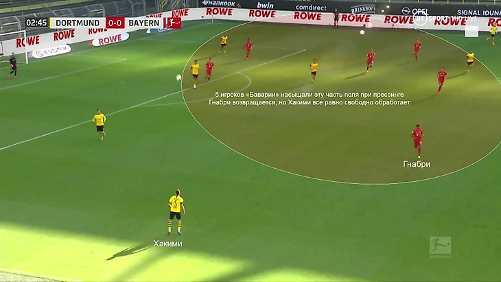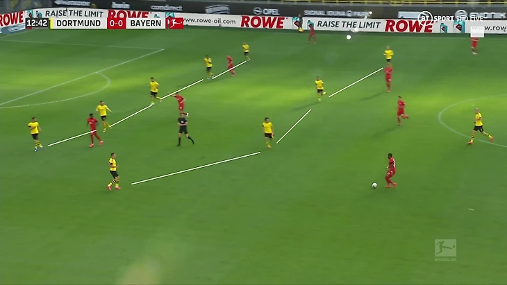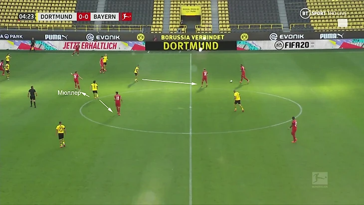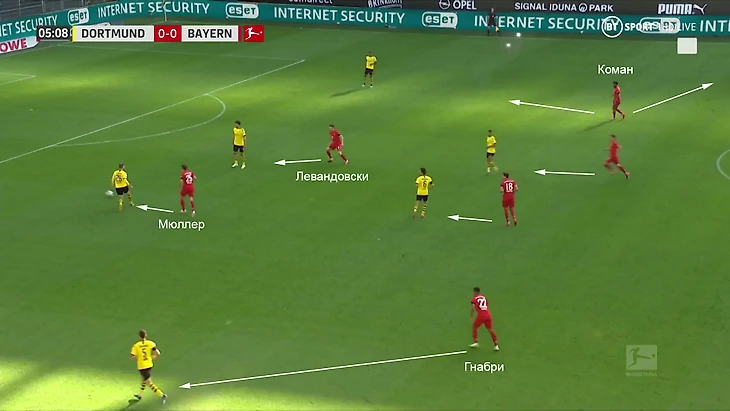 Важное отличие «Баварии» от большинства соперников «Дортмунда»: они не старались душить тройку персонально одними и теми же футболистами. Они оставляли дальнюю сторону свободной, а четверка Гнабри, Мюллер, Коман, Левандовски накрывала тройку защитников и одного латераля. Грубо говоря, Гнабри и Коман поочередно помогали Мюллеру и Левандовскому.