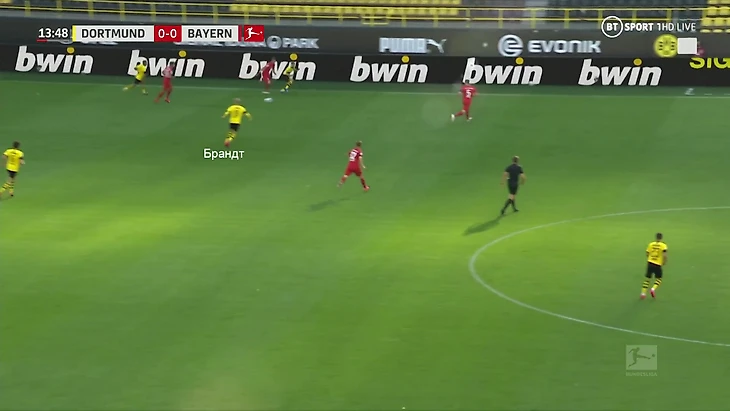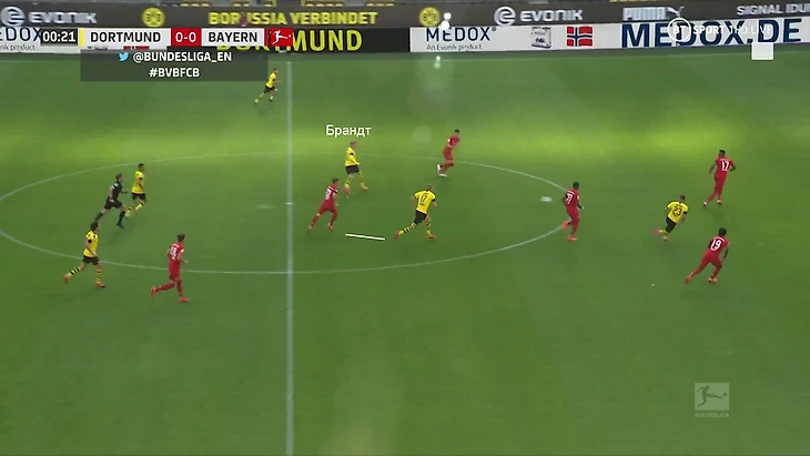 6. Третий вариант «Боруссии» под давлением – игра через Юлиана Брандта. По схеме немец располагался рядом с Торганом Азаром, но на практике свободно интерпретировал эту роль. Он возникал и на позиции левого защитника: