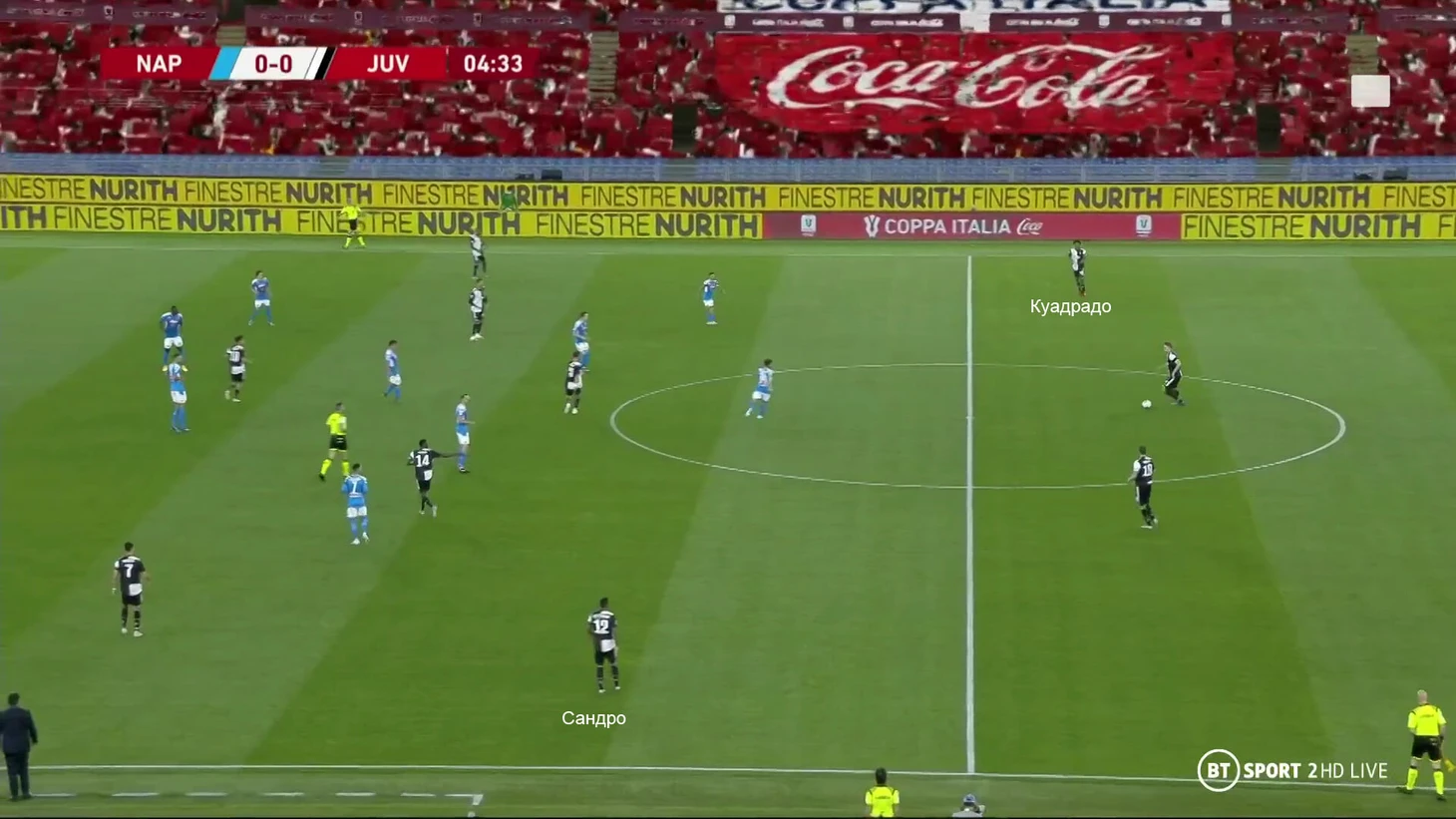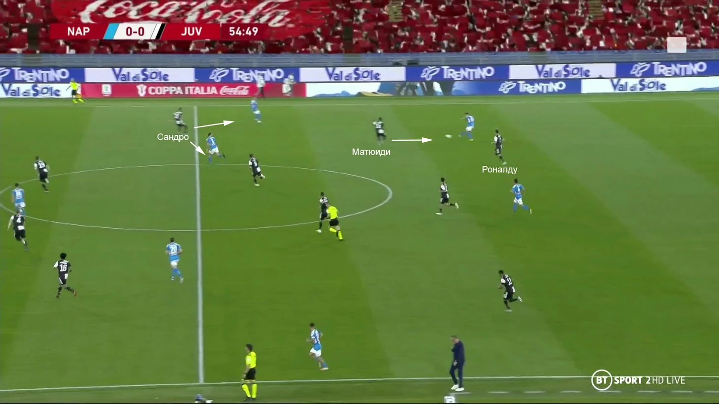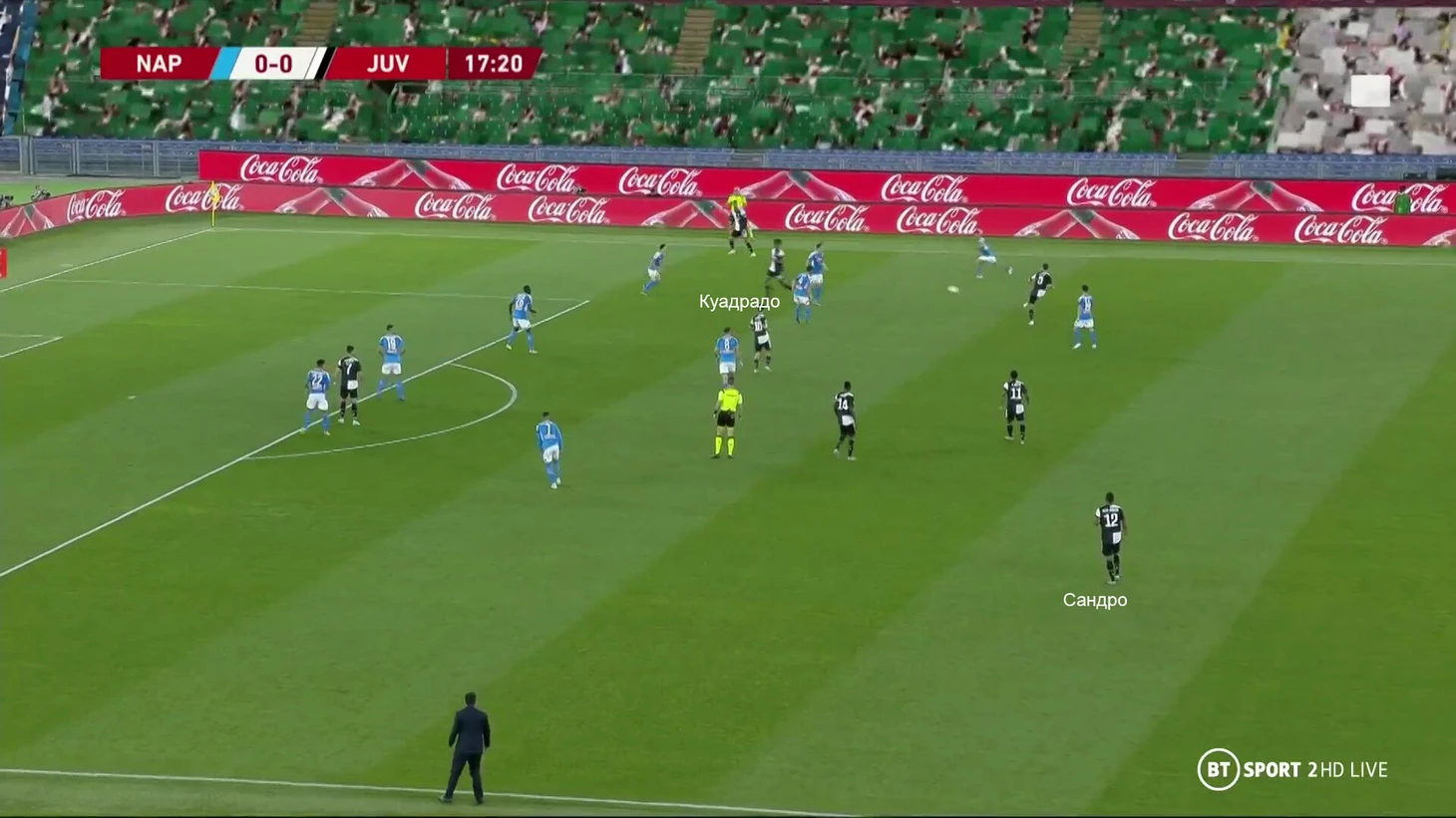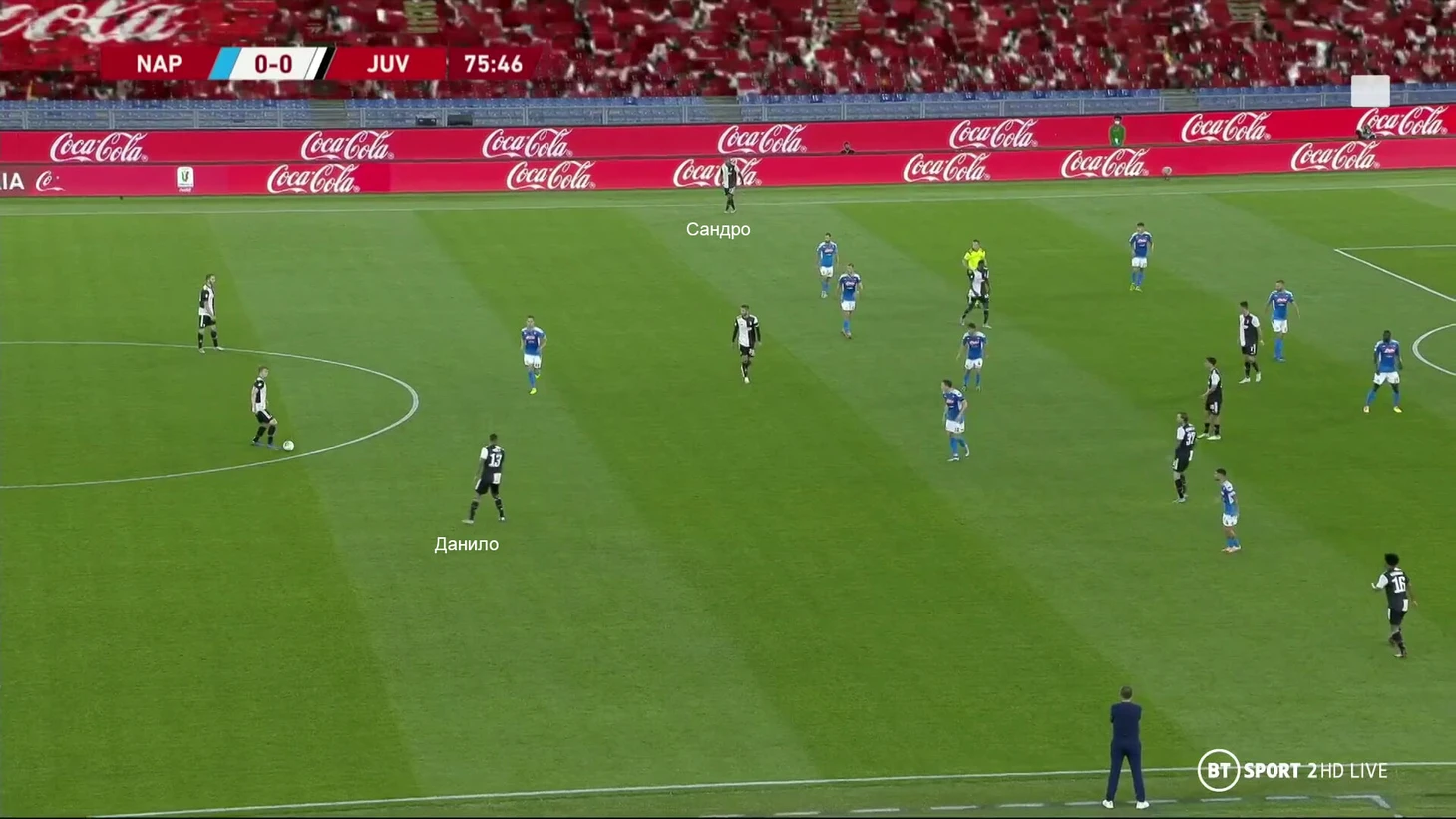 «Наполи» было удобно контролировать соперника. Активная зона, которую нужно было контролировать, банально сокращалась. Идеи «Ювентуса» не поменялись даже в последние минуты – теперь в роли правого защитника Данило, и он очень глубоко при высокой позиции Сандро: