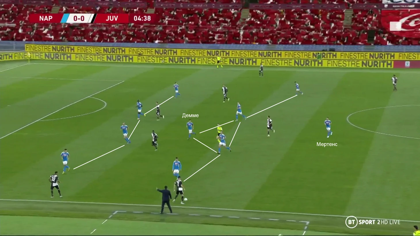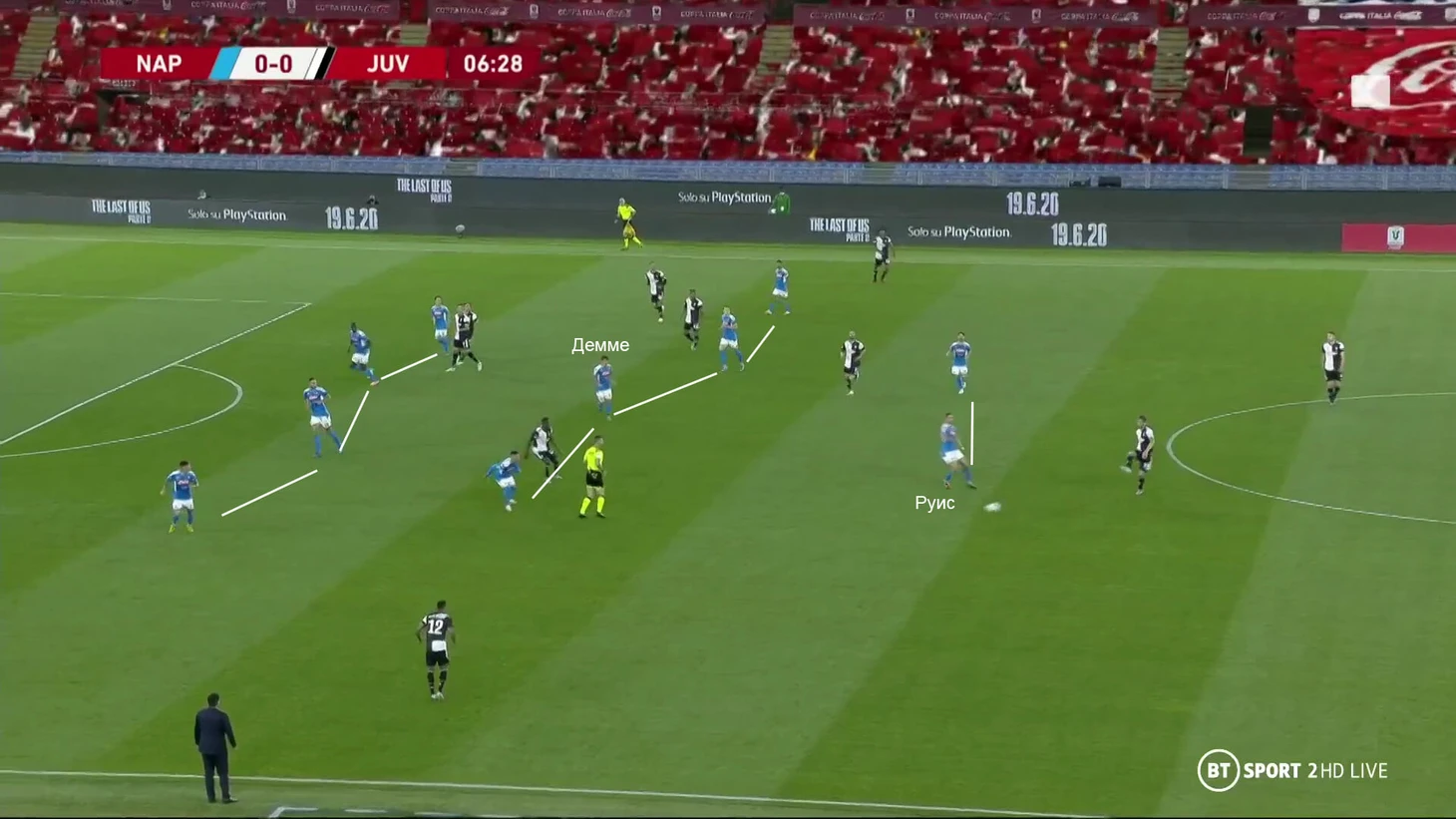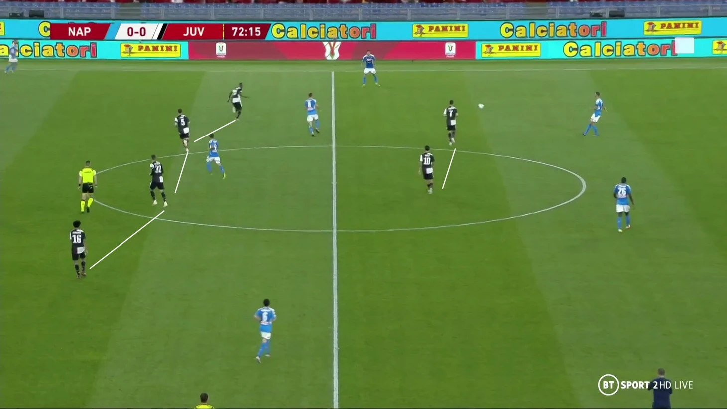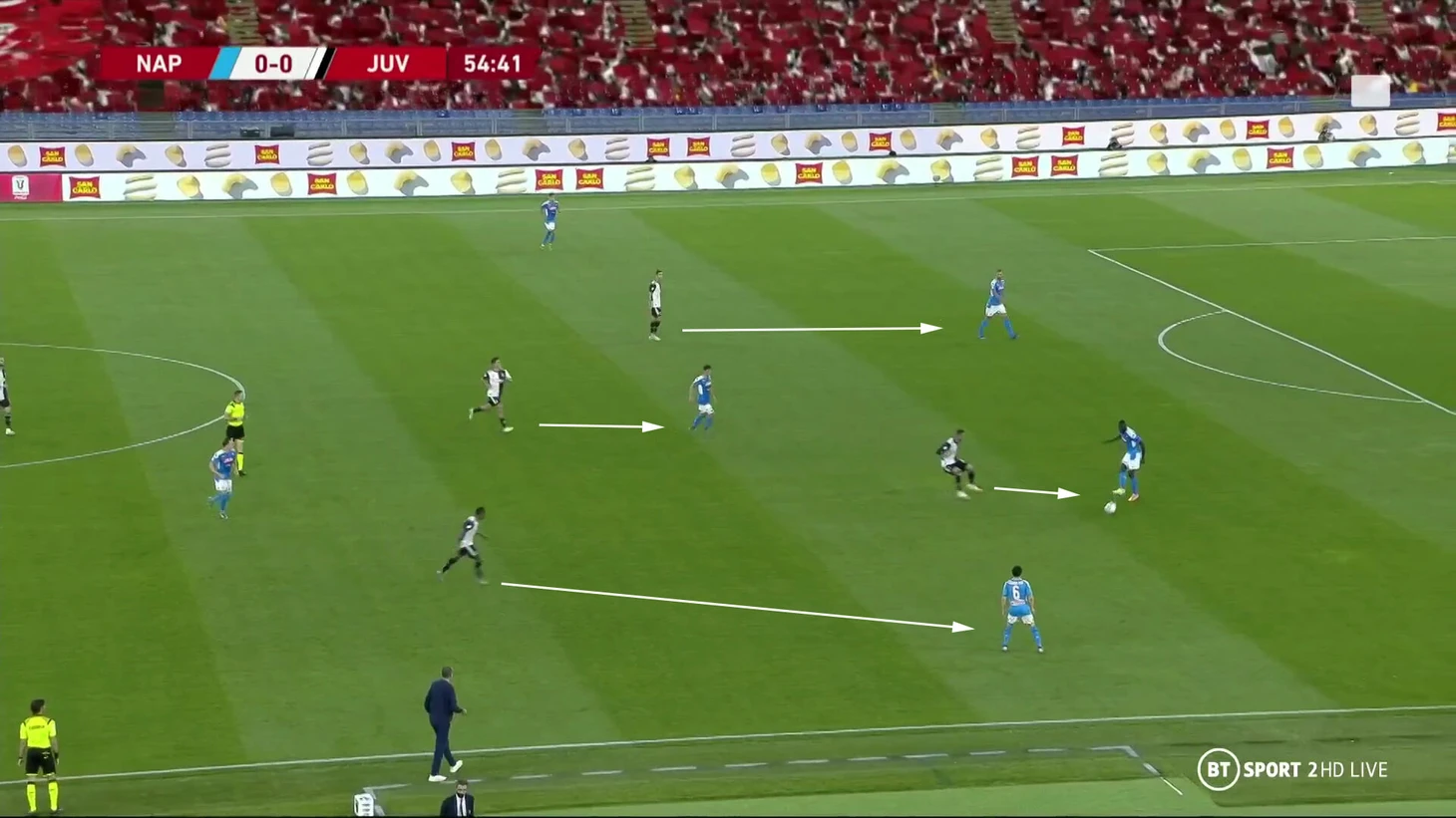 В начале матча это влекло некоторые проблемы: у «Ювентуса» было больше сил для прессинга, плюс иногда игроки «Наполи» порой ошибались в простых ситуациях. Но постепенно это обрело важность и даже дало «Наполи» преимущество.