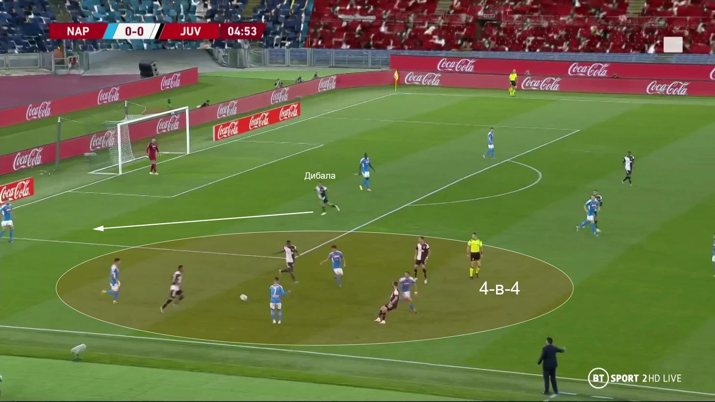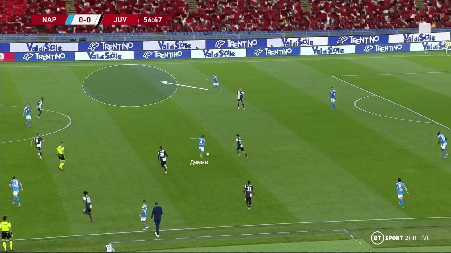 В контексте конкретного матча это давало «Наполи» значимые преимущества. «Юве» становился более предсказуемым и не мог растянуть соперника. Расположение крайних защитников даже намекало «Наполи», куда «Юве» собирается направить атаку.