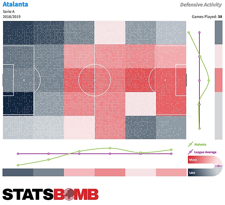 Так выглядит прессинг-карта «Аталанты» (красный цвет – интенсивность прессинга в зоне намного выше средней по лиге):