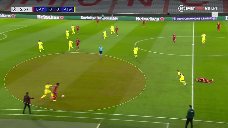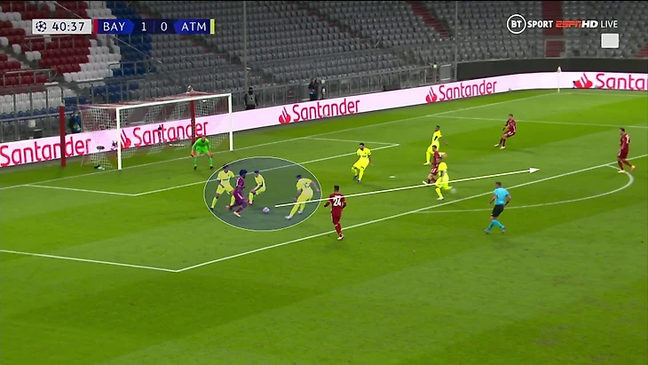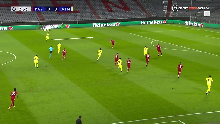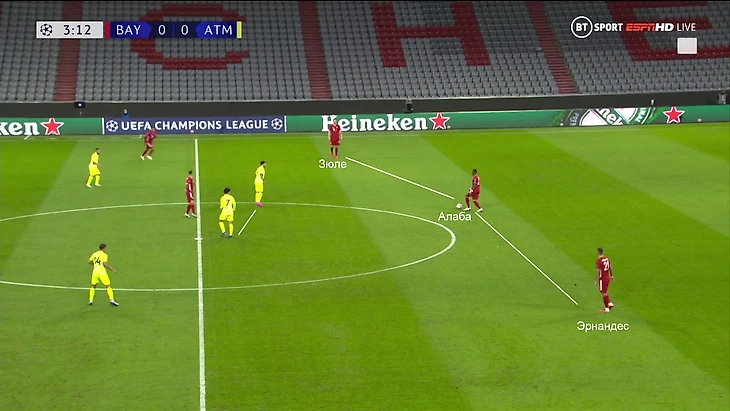 Тренер «Баварии» подготовил специальный прием в розыгрыше под 4-4-2 Симеоне. Зюле, Алаба и Эрнандес (номинально левый защитник) образовывали тройку, когда «Бавария» владела мячом – это давало ситуацию 3-в-2 в первой стадии.
