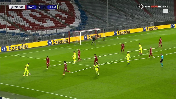 Настолько четкой и акцентированной тройки в других матчах «Бавария» не создает. Используются другие варианты – либо опускания Киммиха/Горетцки к защитникам, либо просто более осторожная позиция защитника на одном фланге, но без перехода на тройку. Решение Флика под глубокие 4-4-2 «Атлетико» отлично сработало.